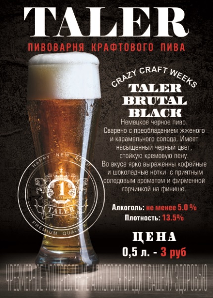 Taler Brutal Black (алкоголь 5%, плотность 13,5%) — немецкое чёрное пиво, сваренное с жжёным и карамельным солодом, имеющее насыщенный чёрный цвет и стойкую кремовую пену, с кофейными и шоколадными нотками и солодовым ароматом.