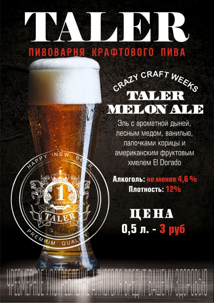 На этот раз вниманию публики будет представлен Taler Melon Ale (алкоголь 4,6%, плотность 12%). Пиво сварено с добавлением дыни, дикого мёда, ванили, корицы, а также американского хмеля El Dorado. Цена за 0,5 л составит Br 3.